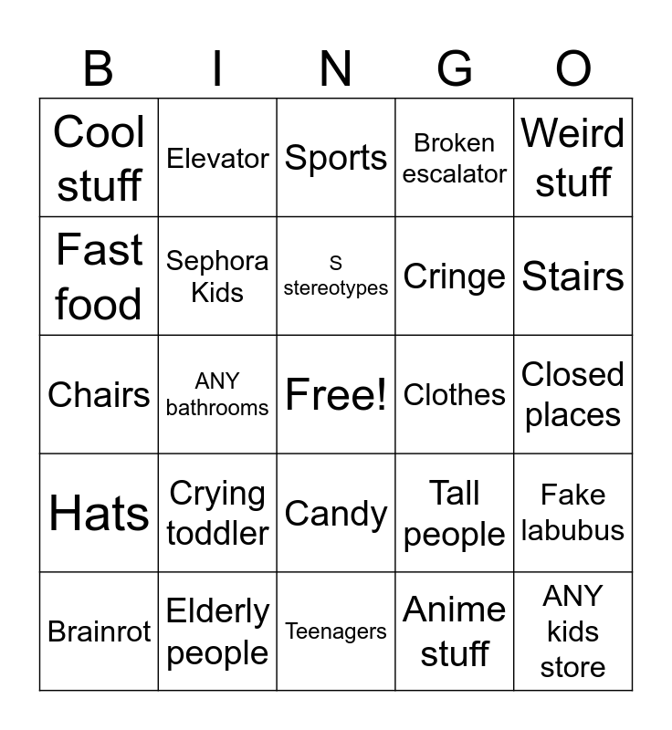 This bingo card has a free space and 24 words: Crying toddler, Elderly people, S stereotypes, Brainrot, Weird stuff, Cool stuff, Fast food, Elevator, Clothes, Candy, Cringe, Chairs, Tall people, Fake labubus, Sephora Kids, Anime stuff, Closed places, Sports, Stairs, ANY bathrooms, ANY kids store, Hats, Broken escalator and Teenagers.