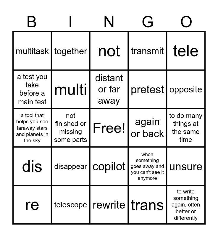 This bingo card has a free space and 34 words: co, trans, pre, in and un, dis, multi, tele, re, together, across, beyond, through, change thoroughly, distant or far away, not, before, many, again or back, opposite, telescope, a tool that helps you see faraway stars and planets in the sky, disappear, when something goes away and you can't see it anymore, copilot, a helper who rides with a pilot to assist in flying an airplane, multitask, to do many things at the same time, rewrite, to write something again, often better or differently, transmit, to send information or signals to someone else, pretest, a test you take before a main test, incomplete, not finished or missing some parts, unsure and not sure or feeling uncertain about something.