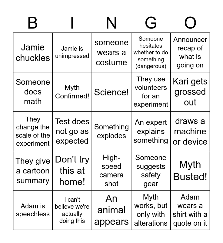 This bingo card has a free space and 24 words: Don't try this at home!, I can't believe we're actually doing this, Science!, Adam is speechless, Announcer recap of what is going on, Jamie chuckles, Someone does math, Jamie is unimpressed, An expert explains something, High-speed camera shot, They use volunteers for an experiment, They change the scale of the experiment, Someone suggests safety gear, Myth Busted!, Myth Confirmed!, Myth works, but only with alterations, draws a machine or device, someone wears a costume, Kari gets grossed out, Test does not go as expected, Adam wears a shirt with a quote on it, They give a cartoon summary, Someone hesitates whether to do something (dangerous) and An animal appears.