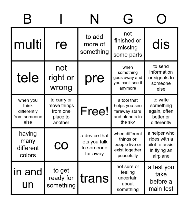 This bingo card has a free space and 25 words: co, trans, pre, in and un, dis, multi, tele, re, a tool that helps you see faraway stars and planets in the sky, a device that lets you talk to someone far away, when something goes away and you can't see it anymore, when you think differently from someone else, when different things or people live or exist together peacefully, a helper who rides with a pilot to assist in flying an airplane, not right or wrong, to do many things at the same time, to write something again, often better or differently, to add more of something, to send information or signals to someone else, to carry or move things from one place to another, a test you take before a main test, to get ready for something, having many different colors, not finished or missing some parts and not sure or feeling uncertain about something.