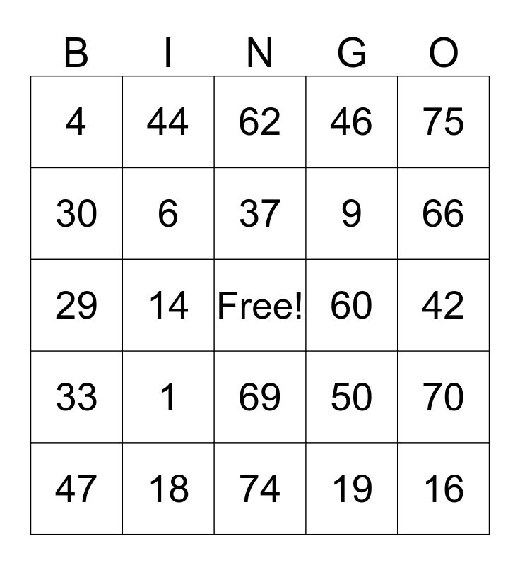 This bingo card has a free space and 24 words: 1, 18, 37, 47, 75, 4, 30, 44, 60, 69, 9, 29, 50, 70, 6, 19, 42, 62, 66, 14, 16, 33, 46 and 74.