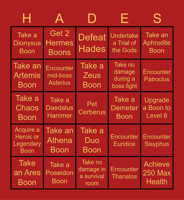 This bingo card has a free space and 24 words: Take an Athena Boon, Take a Poseidon Boon, Take a Zeus Boon, Take an Ares Boon, Take an Aphrodite Boon, Take a Dionysus Boon, Take an Artemis Boon, Get 2 Hermes Boons, Take a Demeter Boon, Take a Duo Boon, Take no damage during a boss fight, Take a Chaos Boon, Encounter Euridice, Encounter Sisyphus, Encounter mid-boss Asterius, Encounter Thanatos, Upgrade a Boon to Level 6, Defeat Hades, Encounter Patroclus, Take a Daedalus Hammer, Achieve 250 Max Health, Acquire a Heroic or Legendary Boon, Undertake a Trial of the Gods and Take no damage in a survival room.