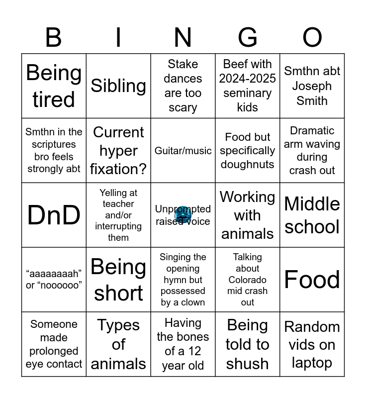 This bingo card has a free space and 24 words: Being short, Types of animals, Guitar/music, Someone made prolonged eye contact, Smthn abt Joseph Smith, Being tired, Smthn in the scriptures bro feels strongly abt, Sibling, Working with animals, Singing the opening hymn but possessed by a clown, Food but specifically doughnuts, DnD, Talking about Colorado mid crash out, Food, Current hyper fixation?, Being told to shush, Middle school, Stake dances are too scary, Dramatic arm waving during crash out, Yelling at teacher and/or interrupting them, Random vids on laptop, “aaaaaaaah” or “noooooo”, Beef with 2024-2025 seminary kids and Having the bones of a 12 year old.
