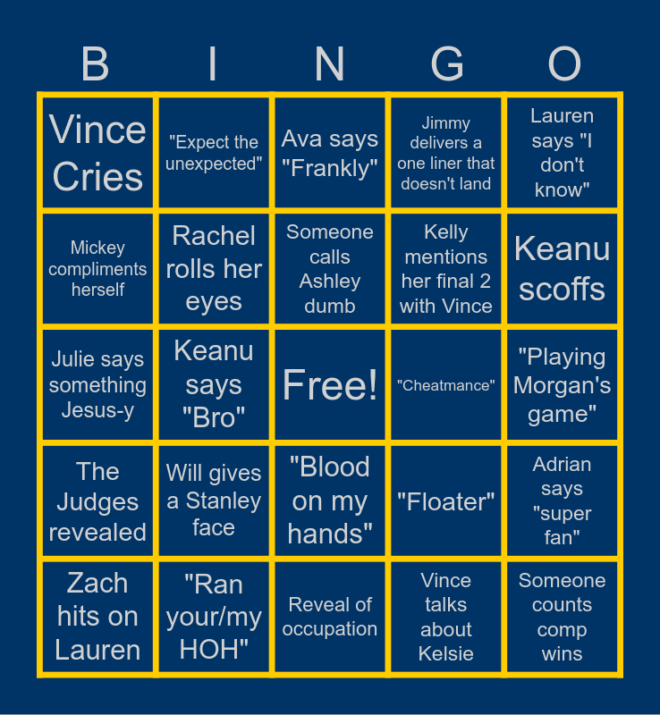 This bingo card has a free space and 30 words: "Ran your/my HOH", Keanu disagrees with Rachel, Keanu says "Bro", Morgan talks about Lauren, Vince Cries, Ava says "Frankly", Rachel rolls her eyes, "Blood on my hands", "Cheatmance", Reveal of occupation, "Playing Morgan's game", Someone counts comp wins, Vince talks about Kelsie, Ashley says "You know what I mean", Keanu scoffs, "Loyalty" is mentioned during a final speech, "Floater", The Judges revealed, Will gives a Stanley face, Lauren says "I don't know", Julie says something Jesus-y, Julie says "But first", "Expect the unexpected", Kelly mentions her final 2 with Vince, Mickey compliments herself, Jimmy delivers a one liner that doesn't land, Adrian says "super fan", Zach hits on Lauren, Someone calls Ashley dumb and Amy is revealed as the accomplice.