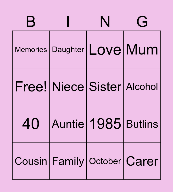 This bingo card has 16 words: Family, Butlins, Love, Memories, 40, Daughter, 1985, October, Free!, Niece, Cousin, Mum, Auntie, Alcohol, Sister and Carer.