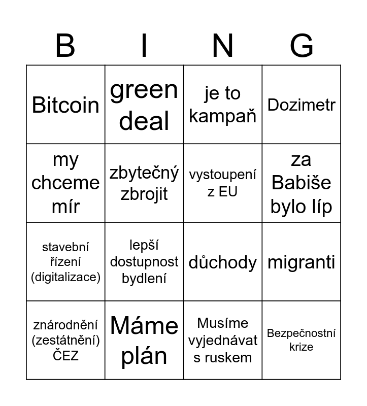 This bingo card has 16 words: Máme plán, migranti, je to kampaň, Bitcoin, stavební řízení (digitalizace), green deal, důchody, Musíme vyjednávat s ruskem, my chceme mír, zbytečný zbrojit, znárodnění (zestátnění) ČEZ, Dozimetr, lepší dostupnost bydlení, za Babiše bylo líp, vystoupení z EU and Bezpečnostní krize.