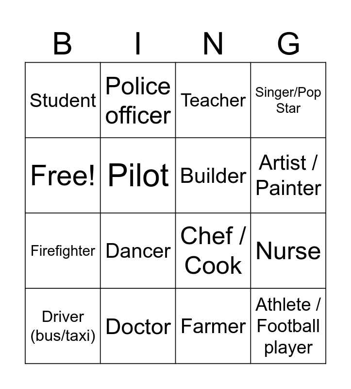 This bingo card has 16 words: Doctor, Nurse, Teacher, Student, Firefighter, Police officer, Chef / Cook, Farmer, Free!, Pilot, Driver (bus/taxi), Singer/Pop Star, Dancer, Artist / Painter, Builder and Athlete / Football player.
