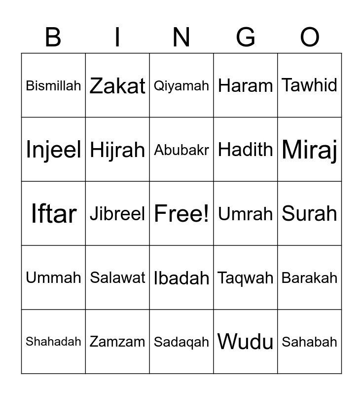 This bingo card has a free space and 24 words: Shahadah, Salawat, Abubakr, Wudu, Tawhid, Bismillah, Zakat, Qiyamah, Umrah, Surah, Iftar, Hijrah, Taqwah, Barakah, Injeel, Zamzam, Sadaqah, Haram, Miraj, Ummah, Jibreel, Ibadah, Hadith and Sahabah.