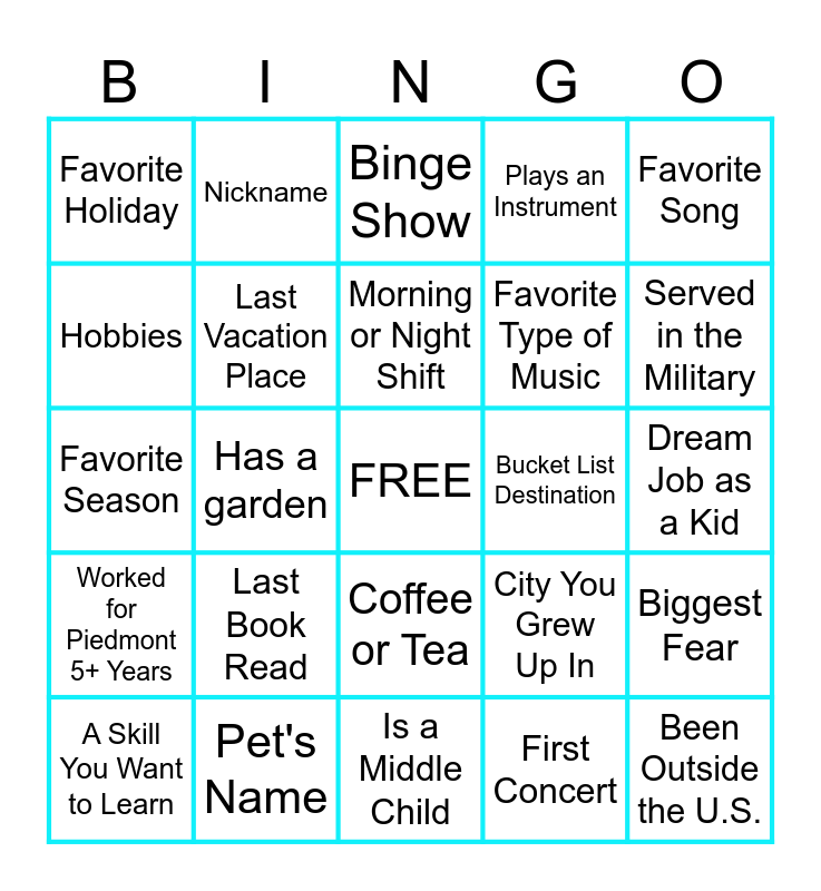 This bingo card has a free space and 24 words: Last Book Read, Pet's Name, Morning or Night Shift, A Skill You Want to Learn, Favorite Song, Favorite Holiday, Hobbies, Nickname, Bucket List Destination, Coffee or Tea, Favorite Type of Music, Favorite Season, City You Grew Up In, Biggest Fear, Last Vacation Place, First Concert, Dream Job as a Kid, Binge Show, Served in the Military, Has a garden, Been Outside the U.S., Worked for Piedmont 5+ Years, Plays an Instrument and Is a Middle Child.