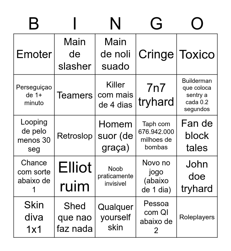 This bingo card has a free space and 24 words: Elliot ruim, Shed que nao faz nada, Killer com mais de 4 dias, Skin diva 1x1, Toxico, Emoter, Perseguiçao de 1+ minuto, Main de slasher, Taph com 676.942.000 milhoes de bombas, Noob praticamente invisivel, 7n7 tryhard, Looping de pelo menos 30 seg, Novo no jogo (abaixo de 1 dia), John doe tryhard, Teamers, Pessoa com QI abaixo de 2, Fan de block tales, Main de noli suado, Builderman que coloca sentry a cada 0.2 segundos, Retroslop, Roleplayers, Chance com sorte abaixo de 1, Cringe and Qualquer yourself skin.