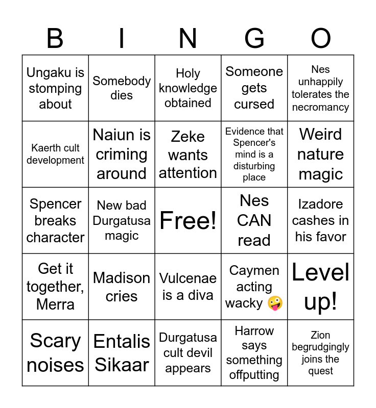 This bingo card has a free space and 24 words: Madison cries, Entalis Sikaar, Zeke wants attention, Scary noises, Nes unhappily tolerates the necromancy, Ungaku is stomping about, Kaerth cult development, Somebody dies, Nes CAN read, Vulcenae is a diva, Evidence that Spencer's mind is a disturbing place, Spencer breaks character, Caymen acting wacky 🤪, Level up!, Naiun is criming around, Harrow says something offputting, Izadore cashes in his favor, Holy knowledge obtained, Weird nature magic, New bad Durgatusa magic, Zion begrudgingly joins the quest, Get it together, Merra, Someone gets cursed and Durgatusa cult devil appears.