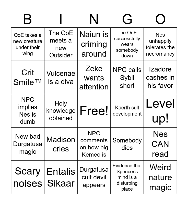 This bingo card has a free space and 24 words: Madison cries, Entalis Sikaar, Zeke wants attention, Scary noises, Nes unhappily tolerates the necromancy, OoE takes a new creature under their wing, Crit Smite™, The OoE meets a new Outsider, Kaerth cult development, NPC comments on how big Kemeo is, NPC calls Sybil short, NPC implies Nes is dumb, Somebody dies, Nes CAN read, Vulcenae is a diva, Evidence that Spencer's mind is a disturbing place, Level up!, Naiun is criming around, Izadore cashes in his favor, Holy knowledge obtained, Weird nature magic, New bad Durgatusa magic, The OoE successfully wears somebody down and Durgatusa cult devil appears.
