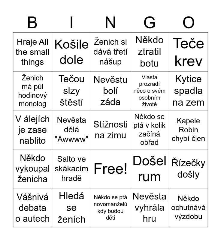 This bingo card has 26 words: Free!, Nevěsta vyhrála hru, Nevěstu bolí záda, Hledá se ženich, Teče krev, Hraje All the small things, Ženich má půl hodinový monolog, Košile dole, Kapele Robin chybí člen, Došel rum, Vlasta prozradí něco o svém osobním životě, V álejích je zase nablito, Řízečky došly, Vášnivá debata o autech, Nevěsta dělá "Awwww", Slovní vyznání lásky pod vlivem, Někdo ztratil botu, Někdo vykoupal ženicha, Ženich si dává třetí nášup, Stížnosti na zimu, Kytice spadla na zem, Někdo se ptá novomanželů kdy budou děti, Někdo se ptá v kolik začíná obřad, Salto ve skákacím hradě, Tečou slzy štěstí and Někdo ochutnává výzdobu.