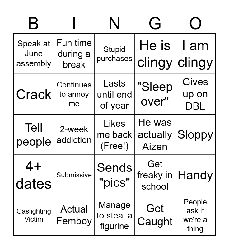 This bingo card has a free space and 24 words: Submissive, Actual Femboy, Lasts until end of year, Gaslighting Victim, I am clingy, Speak at June assembly, Crack, Fun time during a break, He was actually Aizen, Sends "pics", "Sleep over", Tell people, Get freaky in school, Handy, Continues to annoy me, Get Caught, Sloppy, Stupid purchases, Gives up on DBL, 2-week addiction, People ask if we're a thing, 4+ dates, He is clingy and Manage to steal a figurine.