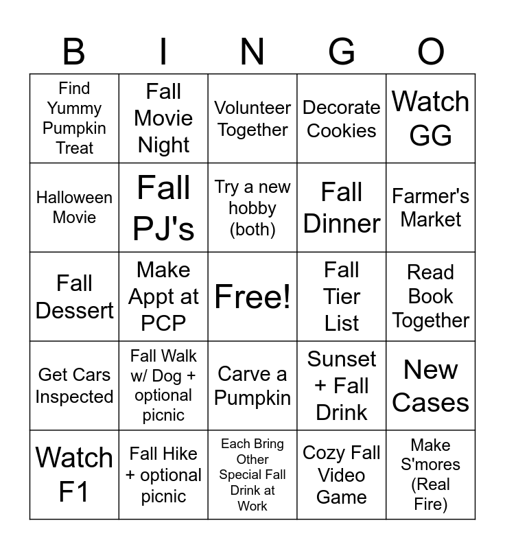 This bingo card has a free space and 24 words: Fall Walk w/ Dog + optional picnic, Fall Hike + optional picnic, Try a new hobby (both), Watch F1, Watch GG, Find Yummy Pumpkin Treat, Halloween Movie, Fall Movie Night, Fall Tier List, Carve a Pumpkin, Fall Dinner, Fall Dessert, Sunset + Fall Drink, New Cases, Fall PJ's, Cozy Fall Video Game, Read Book Together, Volunteer Together, Farmer's Market, Make Appt at PCP, Make S'mores (Real Fire), Get Cars Inspected, Decorate Cookies and Each Bring Other Special Fall Drink at Work.