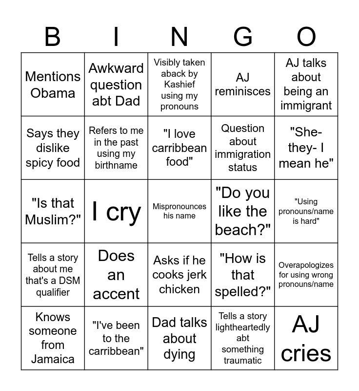 This bingo card has a free space and 24 words: Does an accent, "I've been to the carribbean", "I love carribbean food", Knows someone from Jamaica, AJ talks about being an immigrant, Mentions Obama, Says they dislike spicy food, Awkward question abt Dad, "Do you like the beach?", Asks if he cooks jerk chicken, Question about immigration status, "Is that Muslim?", "How is that spelled?", Overapologizes for using wrong pronouns/name, Refers to me in the past using my birthname, Tells a story lightheartedly abt something traumatic, "Using pronouns/name is hard", Visibly taken aback by Kashief using my pronouns, "She-they- I mean he", I cry, AJ cries, Tells a story about me that's a DSM qualifier, AJ reminisces and Dad talks about dying.