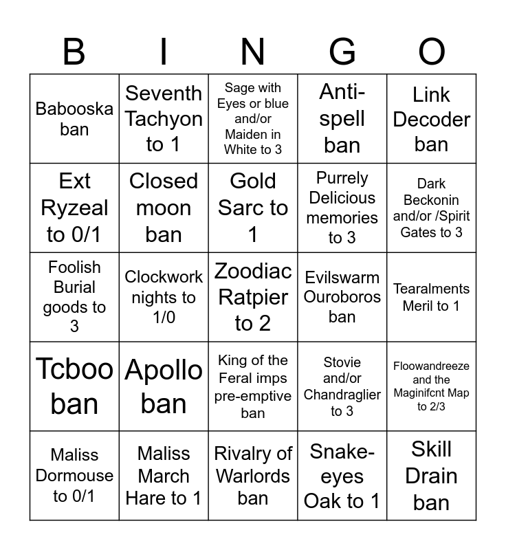 This bingo card has a free space and 24 words: Apollo ban, Maliss March Hare to 1, Gold Sarc to 1, Maliss Dormouse to 0/1, Link Decoder ban, Babooska ban, Ext Ryzeal to 0/1, Seventh Tachyon to 1, Evilswarm Ouroboros ban, King of the Feral imps pre-emptive ban, Purrely Delicious memories to 3, Foolish Burial goods to 3, Stovie and/or Chandraglier to 3, Floowandreeze and the Maginifcnt Map to 2/3, Closed moon ban, Snake-eyes Oak to 1, Tearalments Meril to 1, Sage with Eyes or blue and/or Maiden in White to 3, Dark Beckonin and/or /Spirit Gates to 3, Clockwork nights to 1/0, Skill Drain ban, Tcboo ban, Anti-spell ban and Rivalry of Warlords ban.
