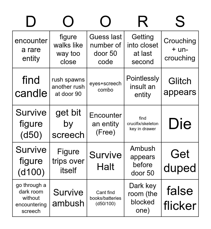 This bingo card has a free space and 29 words: go through a dark room without encountering screech, Survive seek, get bit by screech, get scared by timothy/screech, encounter a rare entity, Guess last number of door 50 code, rush spawns another rush at door 90, Figure trips over itself, find crucifix/skeleton key in drawer, Survive ambush, Die, false flicker, Cant find books/batteries (d50/100), Dark key room (the blocked one), Glitch appears, collect atleast 200 coins, Survive Halt, Survive figure (d100), Crouching + un-crouching, Survive figure (d50), Ambush appears before door 50, reach courtyard, Pointlessly insult an entity, find candle, Getting into closet at last second, figure walks like way too close, Get duped, eyes+screech combo and Get scared a bit by a background noise.