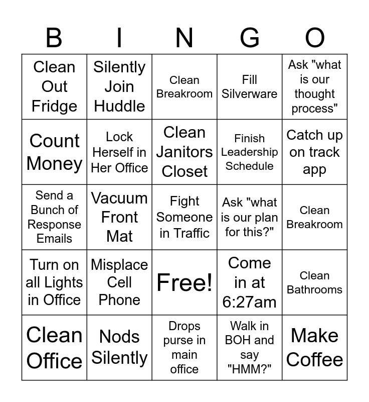 This bingo card has 26 words: Free!, Walk in BOH and say "HMM?", Clean Janitors Closet, Nods Silently, Ask "what is our thought process", Clean Out Fridge, Count Money, Silently Join Huddle, Clean Breakroom, Come in at 6:27am, Finish Leadership Schedule, Send a Bunch of Response Emails, Clean Bathrooms, Clean Office, Vacuum Front Mat, Say "are you going to Chick-Fil-A", Fill Silverware, Turn on all Lights in Office, Clean Breakroom, Fight Someone in Traffic, Catch up on track app, Drops purse in main office, Ask "what is our plan for this?", Misplace Cell Phone, Lock Herself in Her Office and Make Coffee.