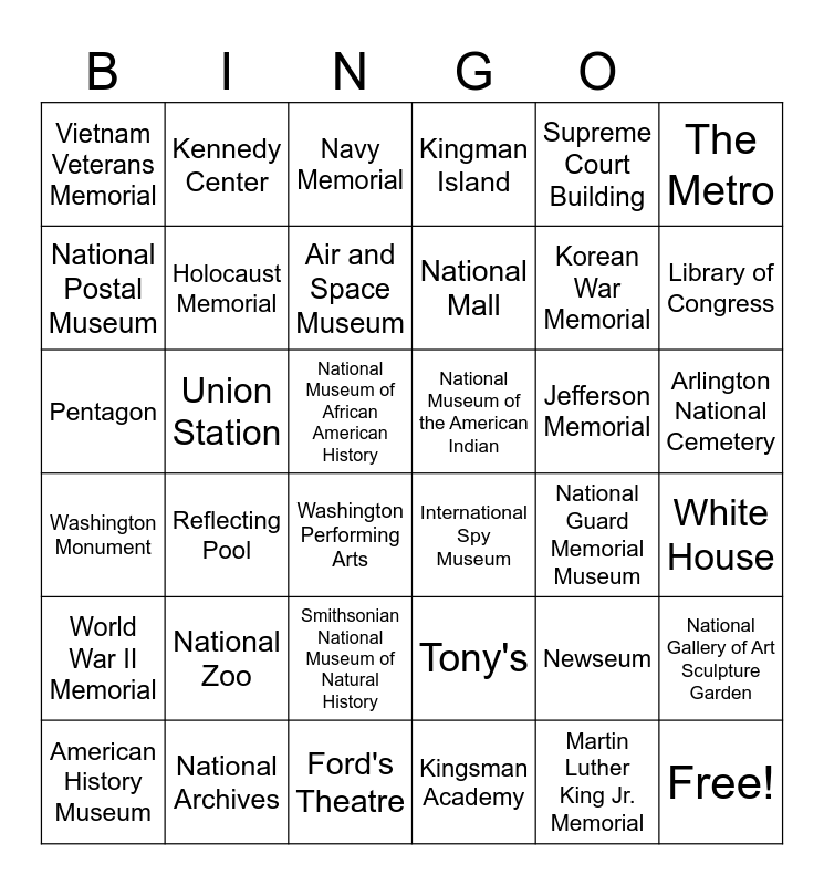 This bingo card has 42 words: Martin Luther King Jr. Memorial, Holocaust Memorial, Capitol, Jefferson Memorial, White House, Reflecting Pool, Pentagon, Mount Vernon, Navy Memorial, Arlington National Cemetery, National Museum of African American History, National Mall, Library of Congress, Supreme Court Building, National Archives, Washington Monument, National Gallery of Art Sculpture Garden, Korean War Memorial, Free!, Kennedy Center, The Metro, Smithsonian National Museum of Natural History, World War II Memorial, Vietnam Veterans Memorial, Lincoln Memorial, American History Museum, Air and Space Museum, Smithsonian Castle, National Zoo, Newseum, US Air Force Memorial, National Museum of the American Indian, National Postal Museum, National Guard Memorial Museum, Ford's Theatre, Washington Performing Arts, International Spy Museum, Union Station, Tony's, Kingsman Academy, Kingman Island and Lincoln Park.