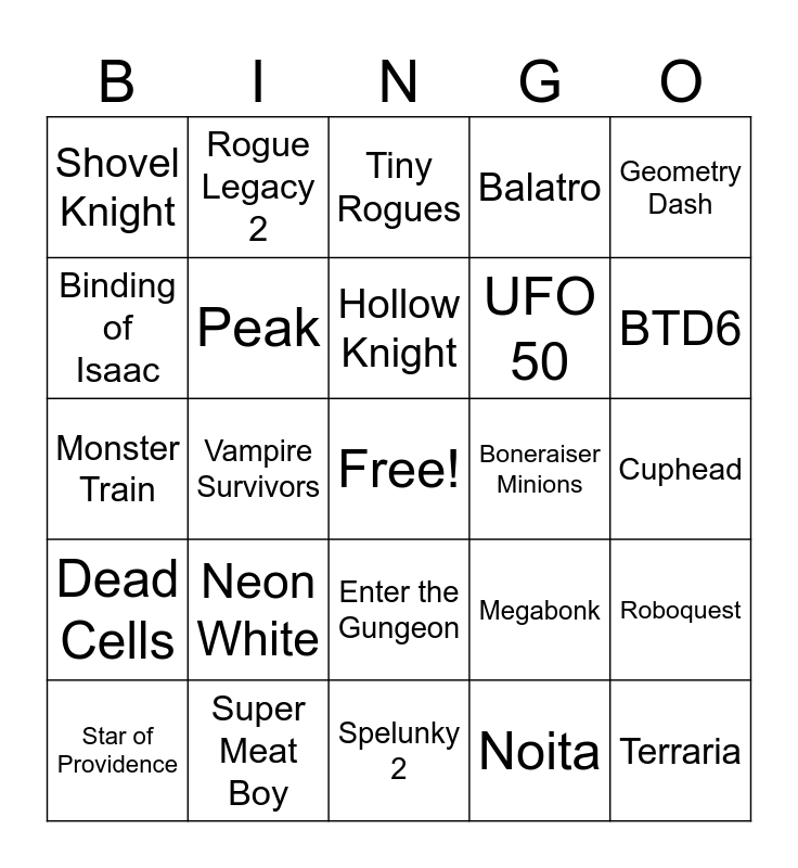 This bingo card has a free space and 38 words: Inscryption Slay the Spire Peak Roboquest Neon White Hollow Knight Silksong Geometry Dash UFO 50 Vampire Survivors Balatro Terraria Cuphead Binding of Isaac Dead Cells PlateUp Tiny Rogues Risk of Rain 2 Boneraiser Minions Shovel Knight, Inscryption, Slay the Spire, Peak, Roboquest, Neon White, Hollow Knight, Silksong, Geometry Dash, UFO 50, Vampire Survivors, Balatro, Terraria, Cuphead, Binding of Isaac, Dead Cells, PlateUp, Tiny Rogues, Risk of Rain 2, Boneraiser Minions, Shovel Knight, Super Meat Boy, BTD6, Star of Providence, Celeste, Spelunky 2, Pizza Tower, Hades, Hades 2, Portal 2, Voidigo, Enter the Gungeon, Noita, Rogue Legacy 2, Ultrakill, Megabonk, Monster Train and Monster Train 2.