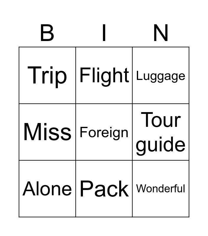 This bingo card has a free space and 11 words: Lost, Pack, Wonderful, Alone, Flight, Luggage, Tour guide, Sightseeing, Miss, Trip and Guidebook.