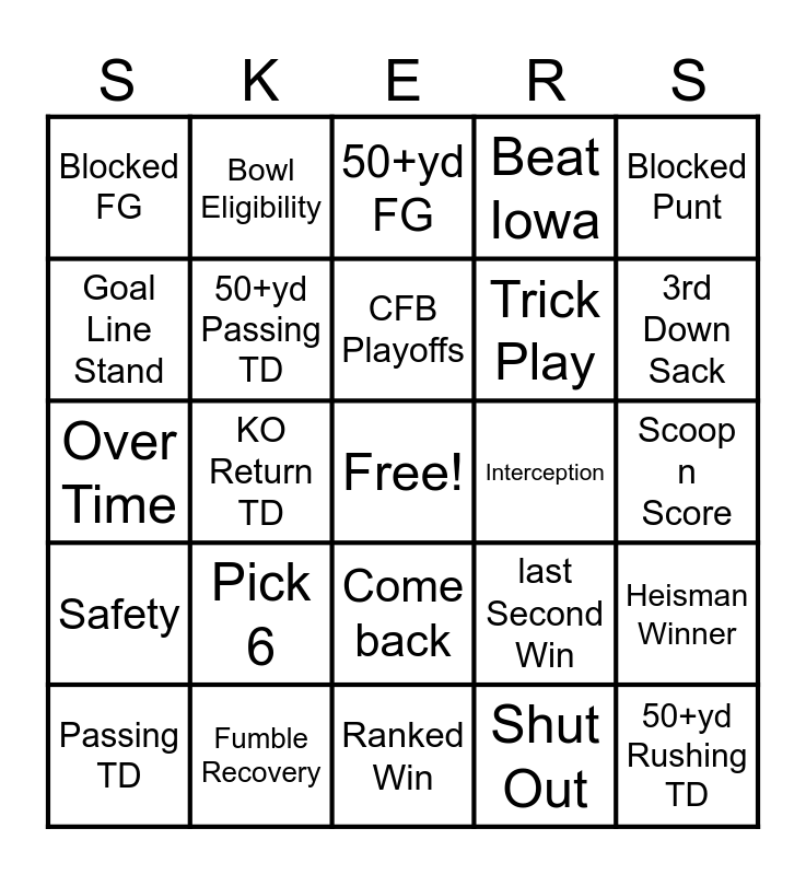 This bingo card has a free space and 29 words: Passing TD, Rushing TD, KO Return TD, Punt Return TD, Blocked FG, 50+yd FG, 50+yd Passing TD, Pick 6, Interception, Fumble Recovery, Scoop n Score, 50+yd Rushing TD, Ranked Win, Shut Out, 3rd Down Sack, Hail Mary, Come back, Safety, Blocked Punt, Over Time, last Second Win, Snow Game, Trick Play, Goal Line Stand, Beat Iowa, Bowl Eligibility, Heisman Winner, CFB Playoffs and 2pt Conversion.