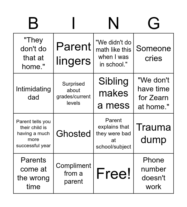 This bingo card has 17 words: Free!, Parents come at the wrong time, "We didn't do math like this when I was in school.", "They don't do that at home.", Ghosted, Someone cries, Trauma dump, Sibling makes a mess, "We don't have time for Zearn at home.", Surprised about grades/current levels, Compliment from a parent, Parent explains that they were bad at school/subject, Intimidating dad, Parent lingers, Parent tells you their child is having a much more successful year, Conference you were anxious about goes way better than expected and Phone number doesn't work.