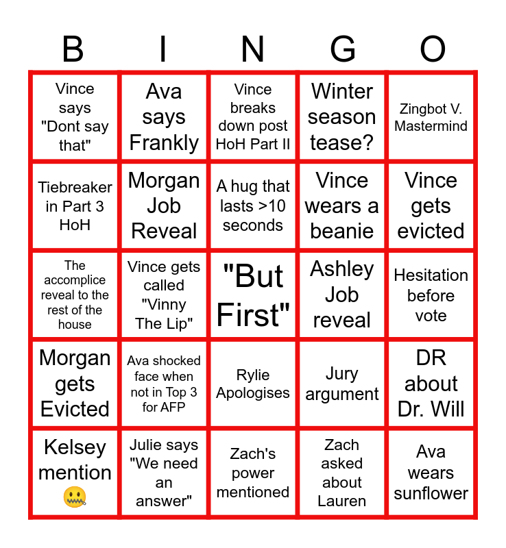 This bingo card has a free space and 84 words: "My Block", Mastermind Reveal, Vince breaks down post HoH Part II, Vorgan Hug, Vorgan Segment, Someone says Confetti, Someone Cries, Lemon Drop mention, Elle Woods reference, Someone says 'Lets Go', Ashleys stares into the camera (DR Dont count), Morgan mentions she was called a snake, Morgan Job Reveal, Ashley Job reveal, Vince no Job Reveal, Vince says "Dont say that", Kelsey mention 🤐, Tiebreaker in Part 3 HoH, Ashley wins Final HoH, Morgan wins Final HoH, "Mince" or "Vorgan" said by Julie, Vince wears a beanie, Ava wears sunflower, Dramatic Vorgan split/exit, Vince gets called "Vinny The Lip", Speech gets cut short, Rachel wears Red, "I was underestimated", Cody says "Comp", Mention of getting Blood on your hands, Ava shocked face when not in Top 3 for AFP, Jimmy throws Shade, Pre Jury cringe, The accomplice reveal to the rest of the house, Rylie prompted to speak, Rylie doesn't speak, Zach's power mentioned, Ashley vote change reveal, Vince gets evicted, Morgan gets Evicted, Ashley gets evicted, Will (Either) makes you laugh, Kelley says irritating, Keanu says something is wrong, Keanu wins AFP, Rachel wins AFP, Ava says Frankly, Someone says something that gets censored, Vince says "I love you", Julie mentions God, Tech issues, Jury argument, Winter season tease?, Keanu and Rachel are BFF again, Taylor cameo, White Locust mention, Julie says "We need an answer", A hug that lasts >10 seconds, Ava Pearl says "Ava Pearl", Hesitation before vote, Bugs get mentioned, Vote is not unanimous, Vote is unanimous, Unlocked guest(s) in audience, Kelley votes in minority, Frankie has glitter, Julie reveals outside world news to HGs, Someone says Hotel Mystere (Not BB Announcer), Zingbot V. Mastermind, 3rd placer gets to make a question to the F2 on the spot, DR about Dr. Will, Pikachu face, BB28 Casting promo, Amazing Race plug, Rylie Apologises, Zach asked about Lauren, Lauren says "I don't know", Vince negative self talk, Vince without Beanie, Ashley cam talk, First Jury question is from a woman, Prejury brings up Cheatmance, 4-3 Vote and At Jury roundtable, Rachel guesses AVA is joining them.