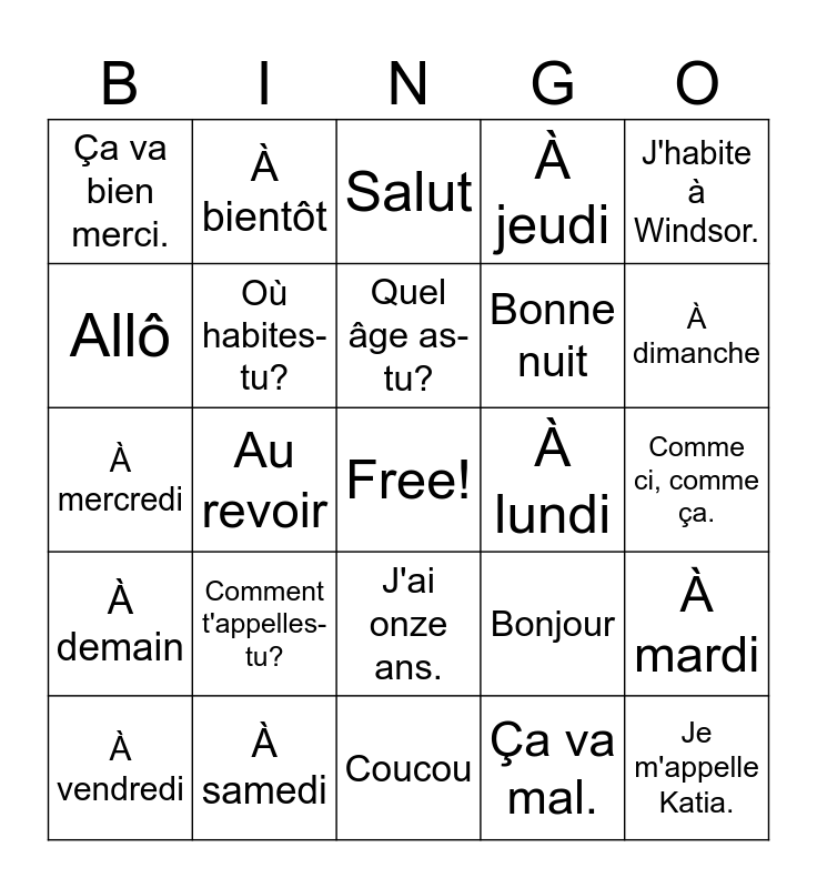 This bingo card has a free space and 27 words: Bonjour, Bonsoir, Bonne nuit, Coucou, Allô, Salut, À bientôt, À demain, À lundi, À mardi, À mercredi, À jeudi, À vendredi, À samedi, À dimanche, Comment ça va?, Où habites-tu?, Quel âge as-tu?, Comment t'appelles-tu?, Ça va bien merci., Comme ci, comme ça., Ça va mal., Au revoir, Je m'appelle Katia., J'ai onze ans., J'habite à Windsor. and Pas mal.