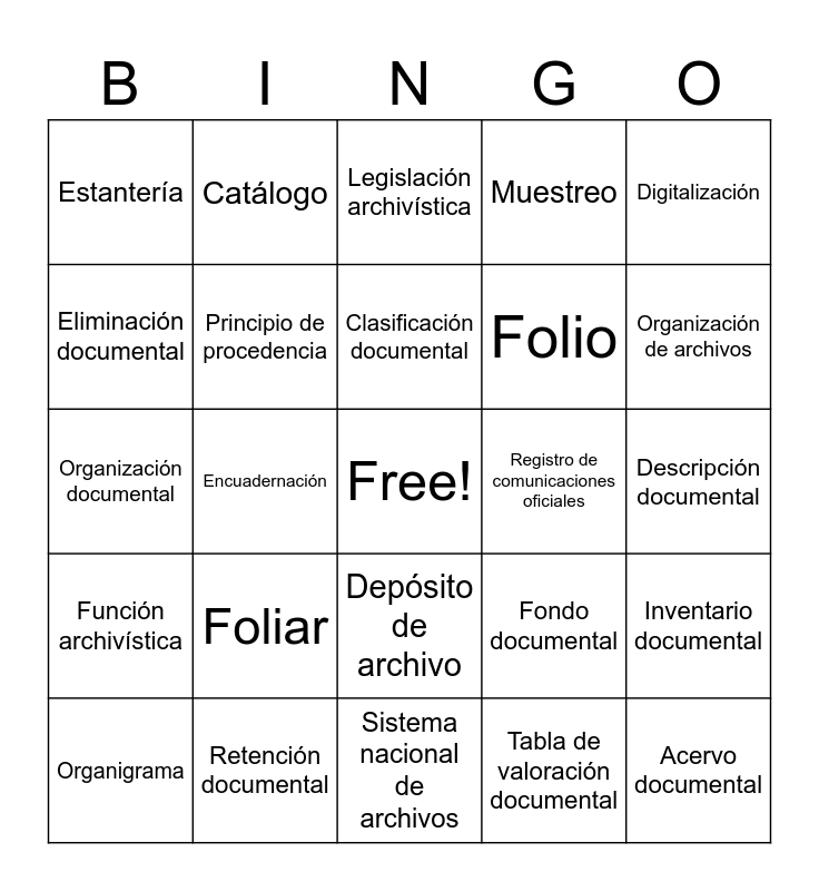 This bingo card has a free space and 68 words: Acceso a documentos de archivo, Acervo documental, Administración de archivos, Archivística, Archivo histórico, Carpeta, Catálogo, Ciclo vital del documento, Clasificación documental, Comité de archivo, Depósito de archivo, Depuración, Descripción documental, Digitalización, Documento electrónico de archivo, Eliminación documental, Encuadernación, Estantería, Expediente, Foliar, Folio, Fondo documental, Función archivística, Fuente primaria de información, Gestión documental, Guía, Identificación documental, Índice, Inventario documental, Legajo, Legislación archivística, Manuscrito, Marca de agua (Filigrana), Microfilmación, Muestreo, Normalización archivística, Ordenación documental, Organigrama, Organización de archivos, Organización documental, Patrimonio documental, Principio de orden original, Principio de procedencia, Producción documental, Protocolo, Radicación de comunicaciones oficiales, Recepción de documentos, Recuperación de documentos, Registro de comunicaciones oficiales, Retención documental, Sección, Selección documental, Serie documental, Sistema nacional de archivos, Subserie, Tabla de retención documental, Tabla de valoración documental, Tipo documental, Tomo, Trámite de documentos, Unidad administrativa, Unidad de conservación, Unidad documental, Valor administrativo, Valor científico, Valor contable, Valor cultural and Valor histórico.