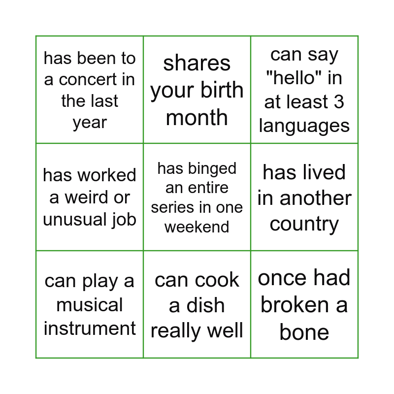 This bingo card has a free space and 8 words: has lived in another country, can say "hello" in at least 3 languages, shares your birth month, can play a musical instrument, has been to a concert in the last year, once had broken a bone, has worked a weird or unusual job and can cook a dish really well.