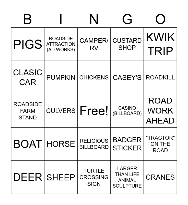 This bingo card has a free space and 38 words: COW, CORN FIELD, APPLE, PUMPKIN, "TRACTOR" ON THE ROAD, HORSE, CHICKENS, LAMA/ ALPACA, KWIK TRIP, CASEY'S, CULVERS, CUSTARD SHOP, CRANES, ROAD WORK AHEAD, CLASIC CAR, BOAT, TAILER PARK, CAMPER/ RV, LAWYER BILLBOARD, CASINO (BILLBOARD), PIGS, SHEEP, ROADKILL, DEER, HORSE CROSSING SIGN, TURTLE CROSSING SIGN, BAR, MILK TRUCK, FISH FRY SIGN, DELLS BILLBOARD, FIREWORKS BILLBOAD, RELIGIOUS BILLBOARD, LARGER THAN LIFE ANIMAL SCULPTURE, ROADSIDE ATTRACTION (AD WORKS), BEER GARDEN, BADGER STICKER, ROADSIDE FARM STAND and FIREWOOD STAND.