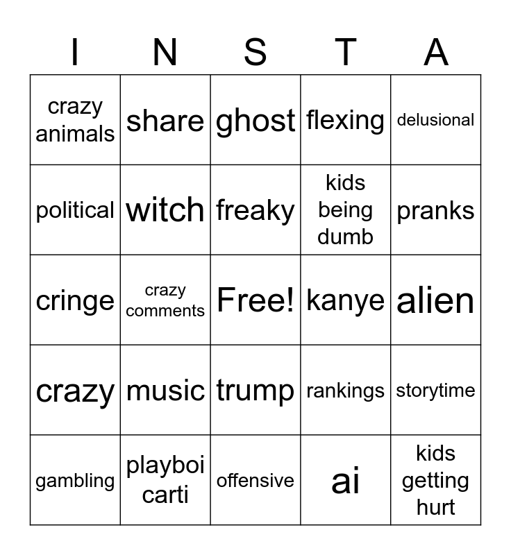 This bingo card has a free space and 29 words: gambling, stock, crazy comments, racist, crazy animals, ghost, witch, music, kanye, playboi carti, alien, kids getting hurt, offensive, ai, pranks, gaza, trump, crazy, delusional, cringe, rankings, alcohol, kids being dumb, political, flexing, share, storytime, freaky and poor.