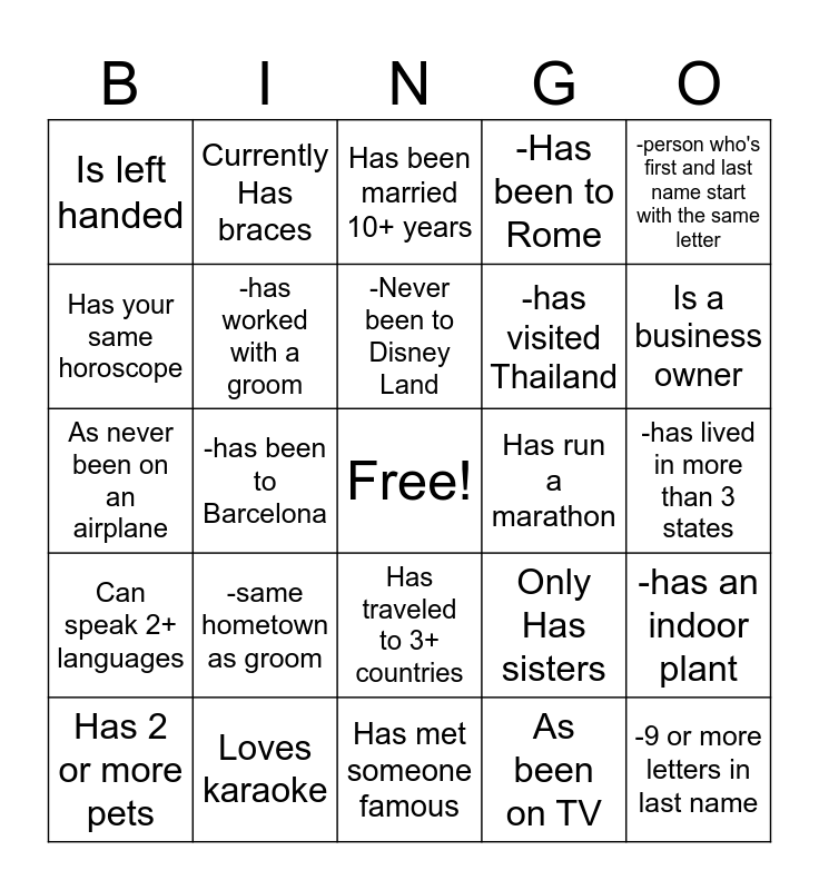 This bingo card has a free space and 38 words: -military served, -has worked or does work in aviation, -sibling of groom, -has worked with a groom, -has an indoor plant, -same hometown as groom, -Never been to Disney Land, -First visit to San Diego, -person who's first and last name start with the same letter, -has visited Thailand, -has been to Barcelona, -Has been to Rome, -9 or more letters in last name, -has lived in more than 3 states, Has your same horoscope, Can speak 2+ languages, Vegetarian or vegan, Has been married 10+ years, Wears your show size, Has run a marathon, Is left handed, Loves karaoke, Is a business owner, Has 2 or more pets, Plays a musical instrument, Has met someone famous, Has 3 or more children, Is wearing contacts, Is the same age as you, Grew up in the same state as you, Is an only child, Has traveled to 3+ countries, As been on TV, Currently Has braces, Took a nap today, Only Has sisters, As never been on an airplane and Never broken a bone.