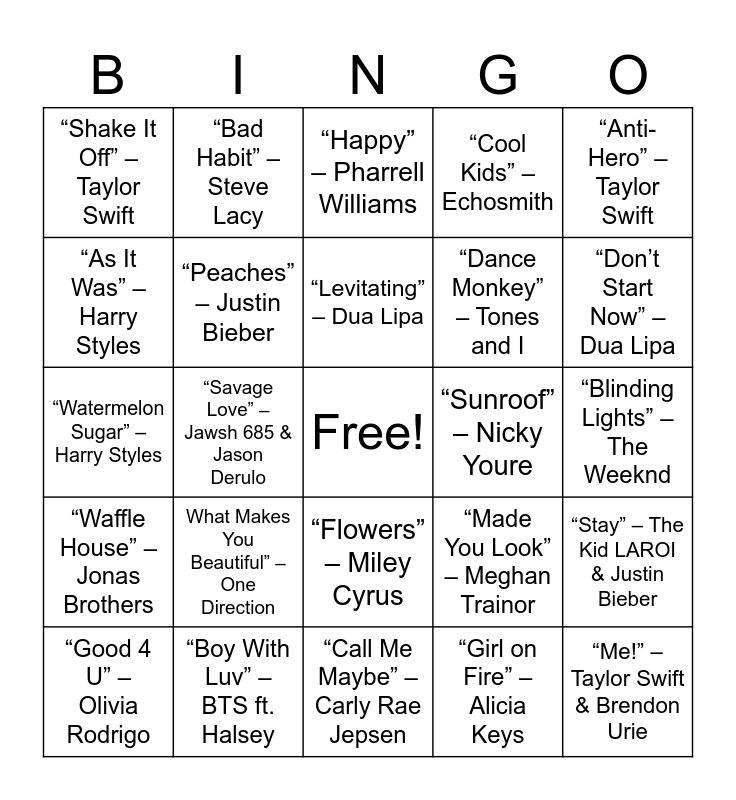 This bingo card has a free space and 25 words: What Makes You Beautiful” – One Direction, “Call Me Maybe” – Carly Rae Jepsen, “Levitating” – Dua Lipa, “Good 4 U” – Olivia Rodrigo, “Anti-Hero” – Taylor Swift, “Shake It Off” – Taylor Swift, “As It Was” – Harry Styles, “Bad Habit” – Steve Lacy, “Sunroof” – Nicky Youre, “Flowers” – Miley Cyrus, “Dance Monkey” – Tones and I, “Watermelon Sugar” – Harry Styles, “Made You Look” – Meghan Trainor, “Stay” – The Kid LAROI & Justin Bieber, “Peaches” – Justin Bieber, “abcdefu” – GAYLE, “Blinding Lights” – The Weeknd, “Happy” – Pharrell Williams, “Don’t Start Now” – Dua Lipa, “Savage Love” – Jawsh 685 & Jason Derulo, “Me!” – Taylor Swift & Brendon Urie, “Boy With Luv” – BTS ft. Halsey, “Waffle House” – Jonas Brothers, “Cool Kids” – Echosmith and “Girl on Fire” – Alicia Keys.