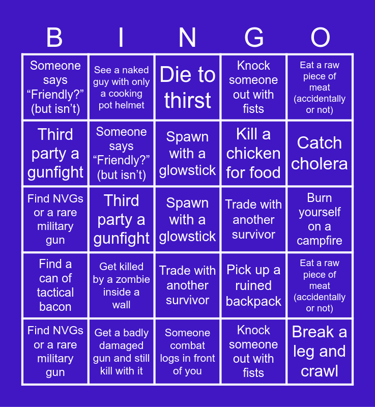 This bingo card has 35 words: Free!, Spot a freshie with no pants, Get killed by a sniper you never saw, Someone says “Friendly?” (but isn’t), Trade with another survivor, Knock someone out with fists, Third party a gunfight, Find a can of tactical bacon, Spawn with a glowstick, Pick up a ruined backpack, Find NVGs or a rare military gun, Eat a raw piece of meat (accidentally or not), Spot a freshie with no pants, Get killed by a sniper you never saw, Someone says “Friendly?” (but isn’t), Trade with another survivor, Knock someone out with fists, Third party a gunfight, Find a can of tactical bacon, Spawn with a glowstick, Pick up a ruined backpack, Find NVGs or a rare military gun, Eat a raw piece of meat (accidentally or not), Get a badly damaged gun and still kill with it, Die to thirst, Catch cholera, Break a leg and crawl, Pass out from blood loss but survive, Kill a chicken for food, Burn yourself on a campfire, Hear random VoIP talking, Someone combat logs in front of you, Get killed by a zombie inside a wall, See a naked guy with only a cooking pot helmet and Find a barrel or tent in a weird spot.