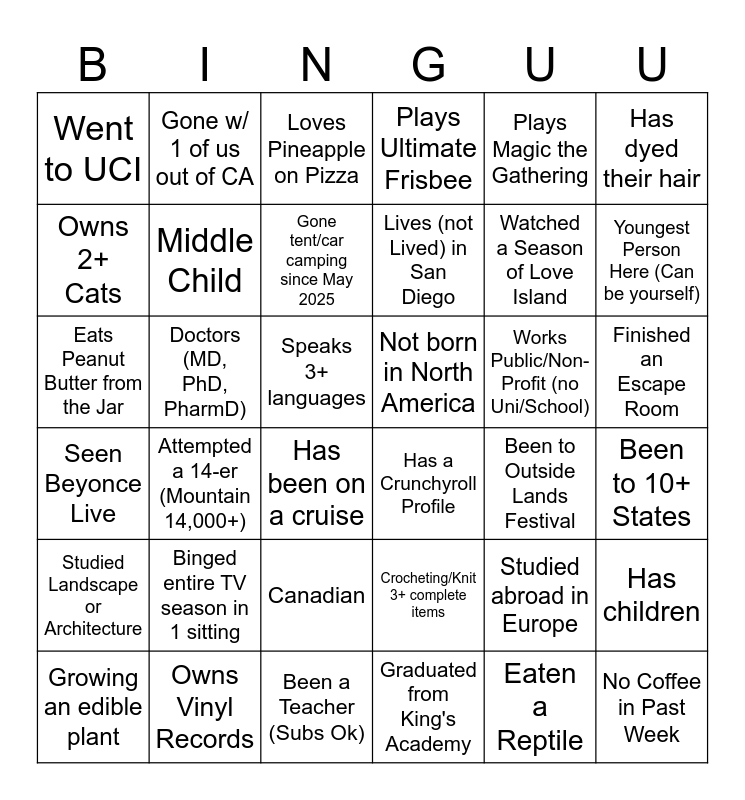 This bingo card has 36 words: Crocheting/Knit 3+ complete items, Canadian, Graduated from King's Academy, Owns 2+ Cats, Seen Beyonce Live, Not born in North America, Middle Child, Been a Teacher (Subs Ok), Plays Magic the Gathering, Studied abroad in Europe, Youngest Person Here (Can be yourself), Plays Ultimate Frisbee, Has children, Doctors (MD, PhD, PharmD), Lives (not Lived) in San Diego, Went to UCI, Studied Landscape or Architecture, Works Public/Non-Profit (no Uni/School), Eats Peanut Butter from the Jar, Loves Pineapple on Pizza, Speaks 3+ languages, Attempted a 14-er (Mountain 14,000+), Has a Crunchyroll Profile, Has been on a cruise, Been to Outside Lands Festival, Gone w/ 1 of us out of CA, Watched a Season of Love Island, Owns Vinyl Records, Gone tent/car camping since May 2025, Has dyed their hair, No Coffee in Past Week, Growing an edible plant, Been to 10+ States, Finished an Escape Room, Binged entire TV season in 1 sitting and Eaten a Reptile.