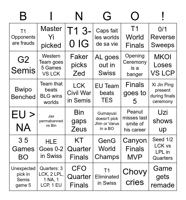 This bingo card has 36 words: GenG World Champs, KT Quarter Finals, T1 Eliminated in Swiss, G2 Semis, EU > NA, EU Team beats TES, Western Team goes 5 Games VS LCK, CFO Quarter Finals, T1 World Finals, Canyon Finals MVP, MKOI Loses VS LCP, Caps fait les worlds de sa vie, Seed 1/2 LCK vs LPL in Quarters, Team that beats BLG wins worlds, AL goes out in Swiss, T1 Opponents are frauds, 3 5 Games BO, Finals goes to 5, Bwipo Benched, T1 3-0 IG, LCK Civil War in Semis, Jax permabanned vs Bin, Gumayusi doesn't pick Jhin or Varus in a BO, Bin gaps Zeus, Peanut misses last smite of his career, Master Yi picked, Opening Ceremony is a banger, Quarters: 3 LCK, 2 LPL, 1 NA, 1 LCP, 1 EU, Faker picks Zed, 0/1 Reverse Sweeps, Game gets remade, Unexpected pick in Semis game 5, Uzi shows up, Xi Jin Ping present during finals ceremony, HLE Goes 0-2 in Swiss and Chovy cries.