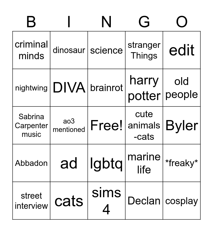 This bingo card has a free space and 24 words: ad, cats, brainrot, street interview, edit, criminal minds, nightwing, dinosaur, cute animals -cats, lgbtq, harry potter, Sabrina Carpenter music, marine life, *freaky*, DIVA, Declan, Byler, science, old people, ao3 mentioned, cosplay, Abbadon, stranger Things and sims 4.