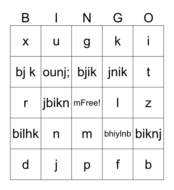 This bingo card has a free space and 44 words: a, b, c, d, e, f, g, h, i, j, k, l, m, n, o, p, q, r, s, t, u, v, w, x, y, z, ubvi, hvbuk, bhiylnb, bilhk, uibnl, biknj, ijnk, bijl, jbikn, njik, bj i, nk, bjik, bj k, jnik, obnj, ounj; and bi hl.