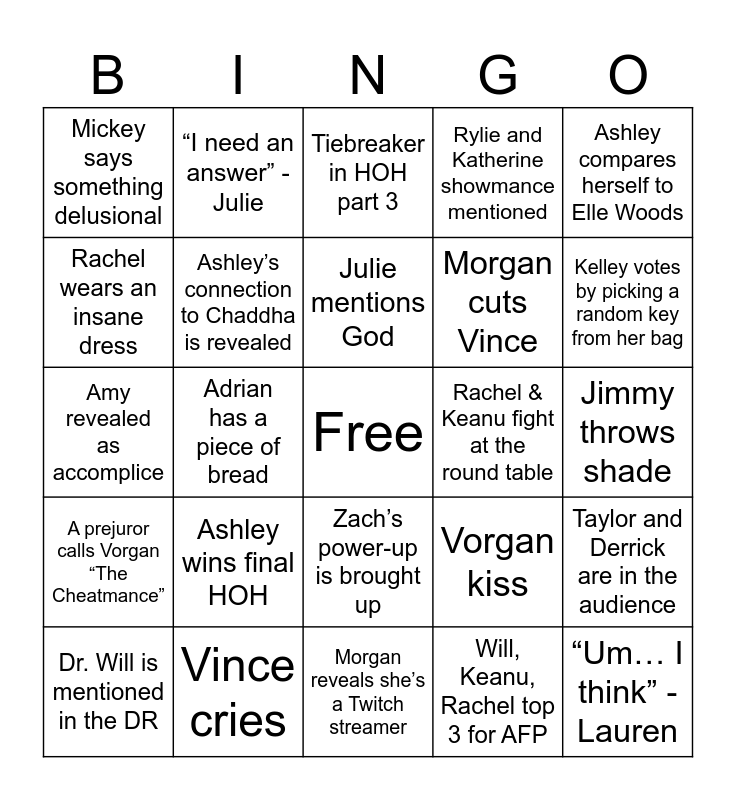 This bingo card has a free space and 24 words: Ashley wins final HOH, Vince cries, Julie mentions God, Dr. Will is mentioned in the DR, Ashley compares herself to Elle Woods, Mickey says something delusional, Rachel wears an insane dress, “I need an answer” - Julie, Rachel & Keanu fight at the round table, Zach’s power-up is brought up, Morgan cuts Vince, Amy revealed as accomplice, Vorgan kiss, Taylor and Derrick are in the audience, Ashley’s connection to Chaddha is revealed, Will, Keanu, Rachel top 3 for AFP, Jimmy throws shade, Tiebreaker in HOH part 3, Kelley votes by picking a random key from her bag, Adrian has a piece of bread, “Um… I think” - Lauren, A prejuror calls Vorgan “The Cheatmance”, Rylie and Katherine showmance mentioned and Morgan reveals she’s a Twitch streamer.