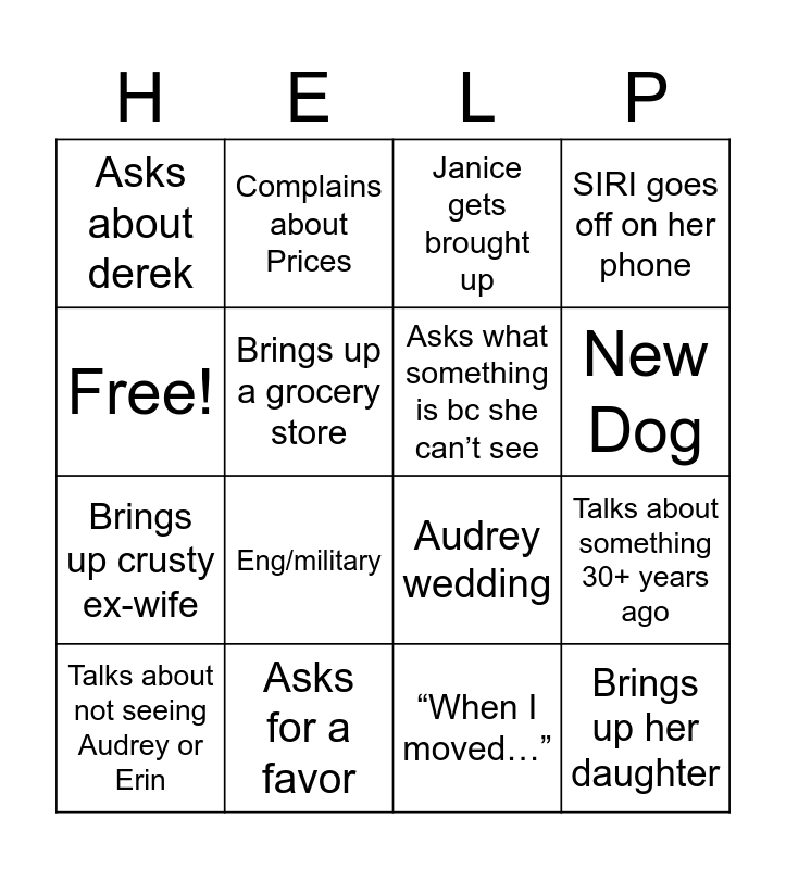 This bingo card has 16 words: Asks for a favor, Talks about something 30+ years ago, Janice gets brought up, Asks about derek, Brings up crusty ex-wife, Complains about Prices, Audrey wedding, “When I moved…”, Free!, Brings up a grocery store, Talks about not seeing Audrey or Erin, SIRI goes off on her phone, Eng/military, New Dog, Asks what something is bc she can’t see and Brings up her daughter.