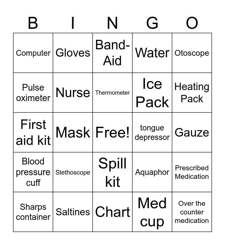 This bingo card has a free space and 24 words: Stethoscope, Saltines, Thermometer, Sharps container, Otoscope, Computer, Pulse oximeter, Gloves, tongue depressor, Spill kit, Ice Pack, First aid kit, Aquaphor, Prescribed Medication, Nurse, Med cup, Gauze, Band-Aid, Heating Pack, Mask, Over the counter medication, Blood pressure cuff, Water and Chart.