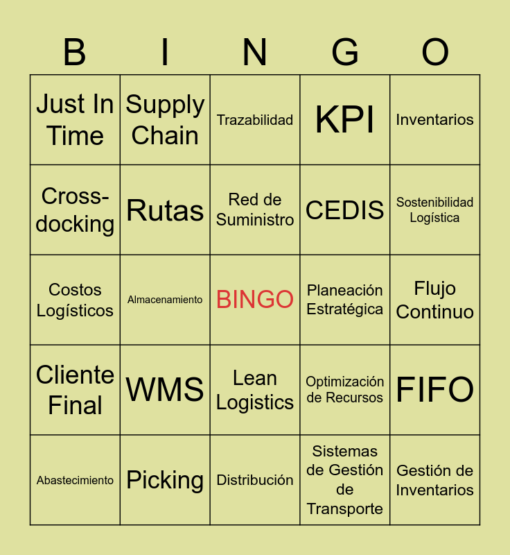 This bingo card has a free space and 24 words: WMS, Picking, Red de Suministro, Abastecimiento, Inventarios, Just In Time, Cross-docking, Supply Chain, Planeación Estratégica, Lean Logistics, CEDIS, Costos Logísticos, Optimización de Recursos, FIFO, Rutas, Sistemas de Gestión de Transporte, Flujo Continuo, Trazabilidad, Sostenibilidad Logística, Almacenamiento, Gestión de Inventarios, Cliente Final, KPI and Distribución.