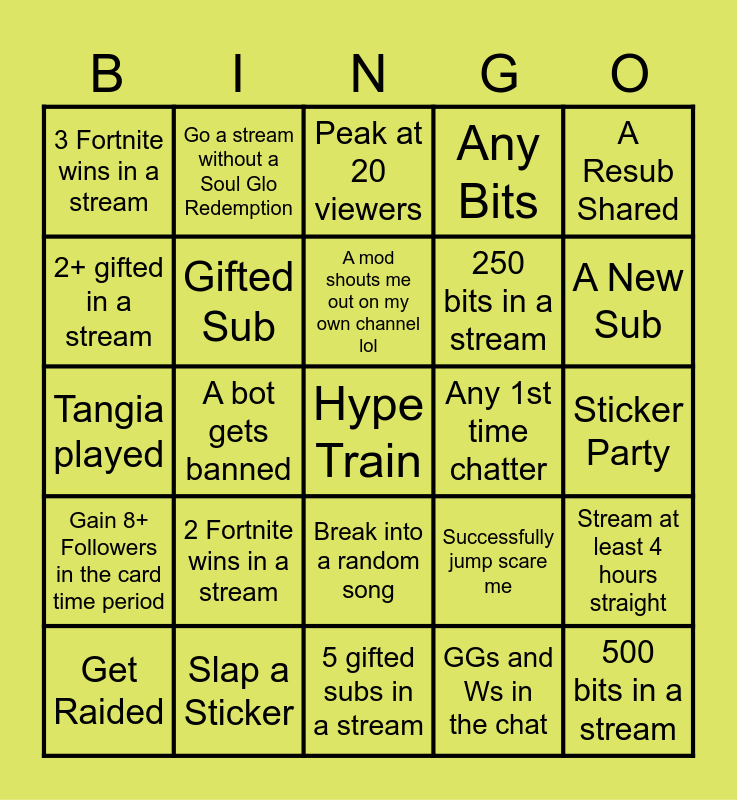 This bingo card has 25 words: 2 Fortnite wins in a stream, 5 gifted subs in a stream, A mod shouts me out on my own channel lol, Get Raided, A Resub Shared, 3 Fortnite wins in a stream, 2+ gifted in a stream, Go a stream without a Soul Glo Redemption, Any 1st time chatter, Break into a random song, 250 bits in a stream, Tangia played, Successfully jump scare me, Stream at least 4 hours straight, Gifted Sub, 500 bits in a stream, Sticker Party, Peak at 20 viewers, A New Sub, A bot gets banned, Hype Train, Slap a Sticker, Gain 8+ Followers in the card time period, Any Bits and GGs and Ws in the chat.