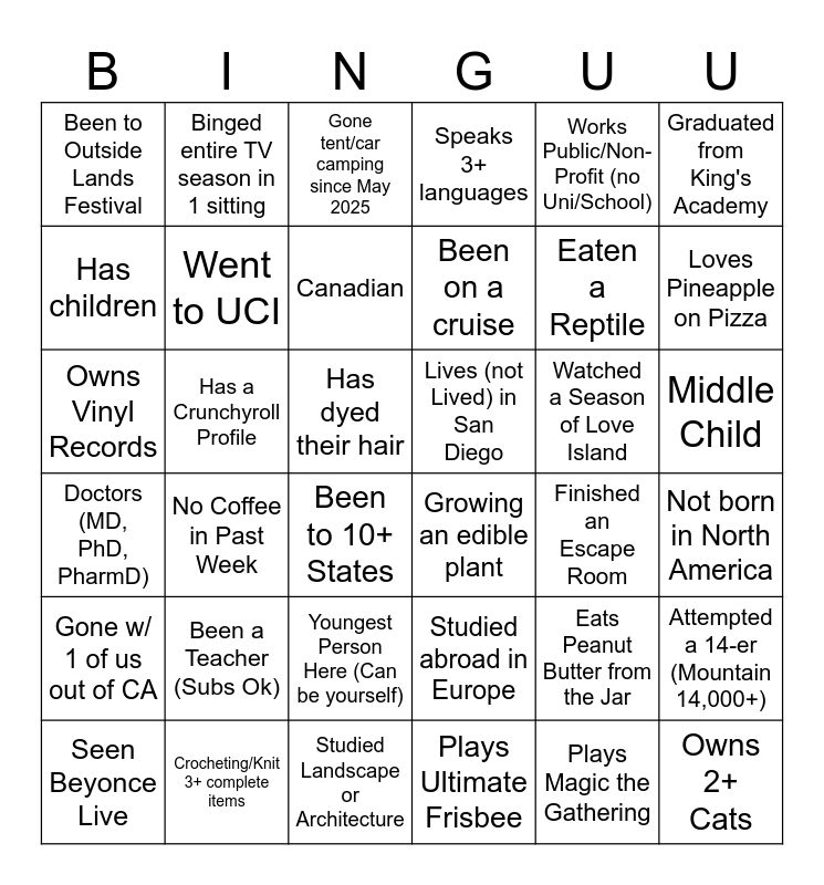 This bingo card has 36 words: Studied abroad in Europe, Youngest Person Here (Can be yourself), Plays Ultimate Frisbee, Has children, Doctors (MD, PhD, PharmD), Lives (not Lived) in San Diego, Went to UCI, Studied Landscape or Architecture, Works Public/Non-Profit (no Uni/School), Eats Peanut Butter from the Jar, Loves Pineapple on Pizza, Speaks 3+ languages, Attempted a 14-er (Mountain 14,000+), Has a Crunchyroll Profile, Been on a cruise, Been to Outside Lands Festival, Gone w/ 1 of us out of CA, Watched a Season of Love Island, Owns Vinyl Records, Gone tent/car camping since May 2025, Has dyed their hair, No Coffee in Past Week, Growing an edible plant, Been to 10+ States, Finished an Escape Room, Binged entire TV season in 1 sitting, Eaten a Reptile, Crocheting/Knit 3+ complete items, Canadian, Graduated from King's Academy, Owns 2+ Cats, Seen Beyonce Live, Not born in North America, Middle Child, Been a Teacher (Subs Ok) and Plays Magic the Gathering.