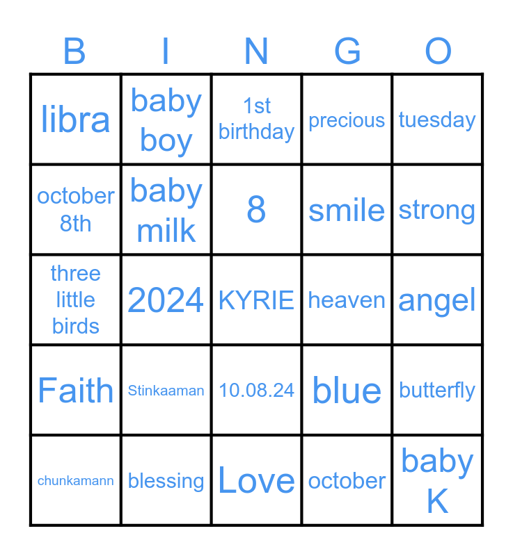This bingo card has a free space and 24 words: chunkamann, Stinkaaman, 8, october, tuesday, libra, baby boy, 1st birthday, heaven, angel, three little birds, baby milk, blue, butterfly, october 8th, blessing, Love, precious, strong, Faith, 2024, 10.08.24, smile and baby K.
