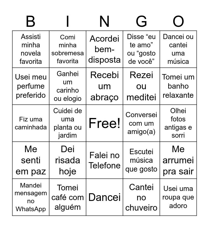 This bingo card has a free space and 24 words: Dei risada hoje, Tomei café com alguém, Recebi um abraço, Mandei mensagem no WhatsApp, Dancei ou cantei uma música, Assisti minha novela favorita, Usei meu perfume preferido, Comi minha sobremesa favorita, Conversei com um amigo(a), Falei no Telefone, Rezei ou meditei, Fiz uma caminhada, Escutei música que gosto, Me arrumei pra sair, Ganhei um carinho ou elogio, Cantei no chuveiro, Olhei fotos antigas e sorri, Acordei bem-disposta, Tomei um banho relaxante, Cuidei de uma planta ou jardim, Usei uma roupa que adoro, Me senti em paz, Disse “eu te amo” ou “gosto de você” and Dancei.