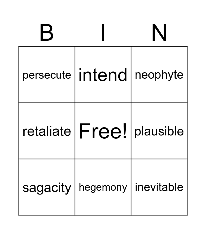 This bingo card has a free space and 8 words: plausible, neophyte, intend, sagacity, persecute, inevitable, retaliate and hegemony.